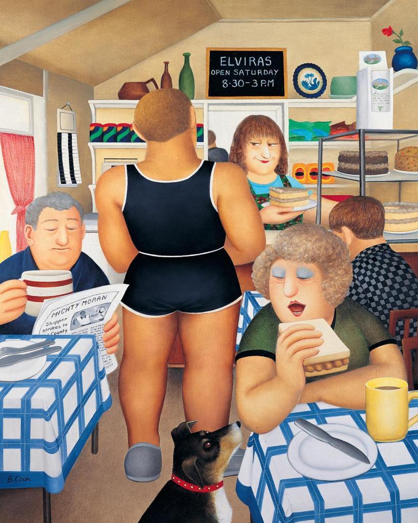 I’ve a particular interest in the Beryl Cook painting shown here – Elvira’s Cafe, at the Admiral’s Hard, Stonehouse, Plymouth – as my grandparents had a small general store just a few hundred yards away on the same street. The Hard ends in a jetty from which you can catch a ferry across the Tamar to Cremyll in Cornwall. I have lovely memories of the ferry and the cafe; they’re a vivid part of my childhood.