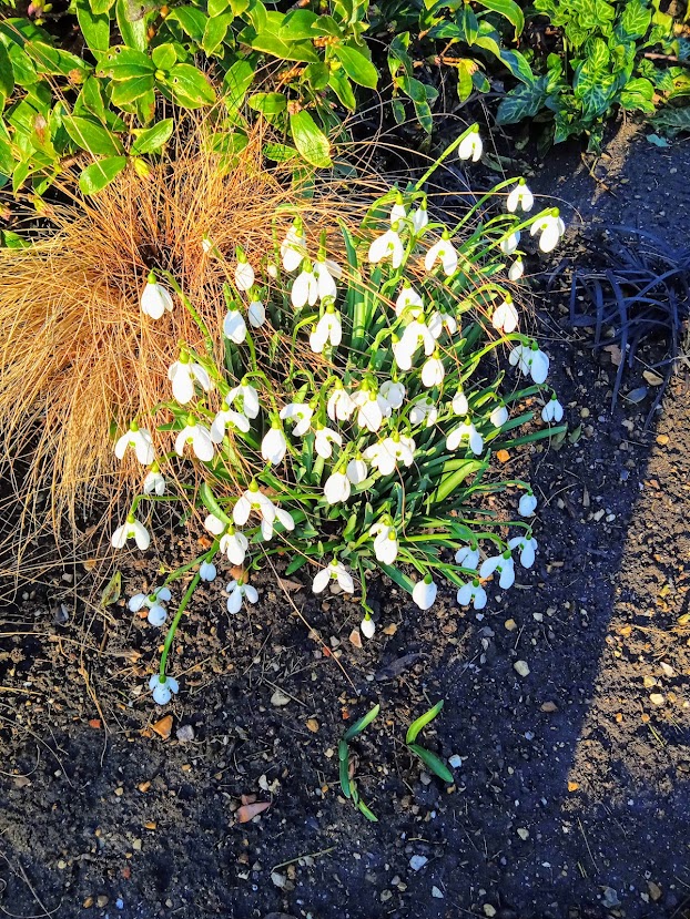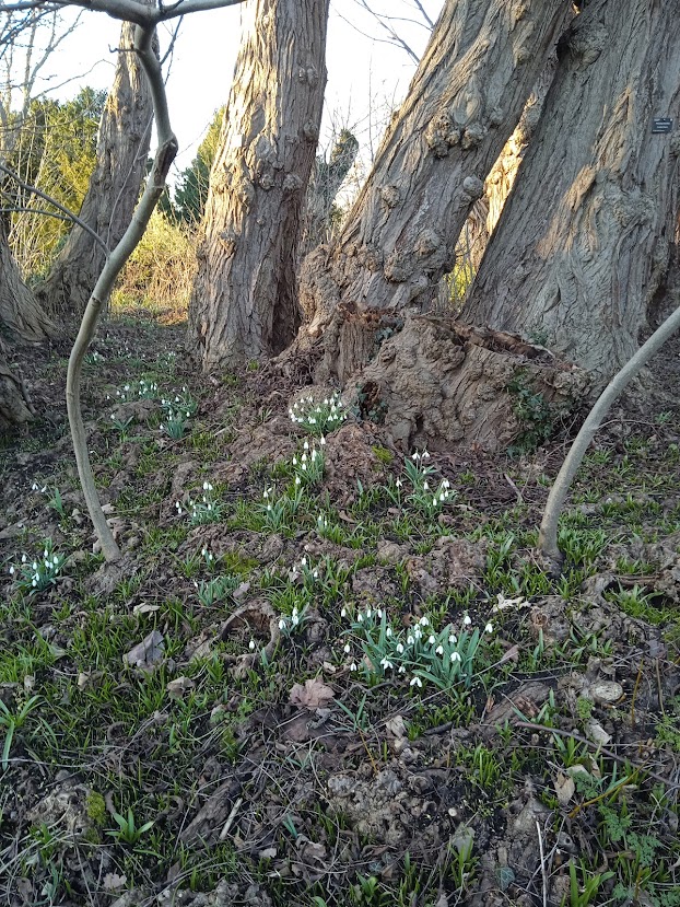 The Cambridge Botanic Garden is twinkling with snowdrops and pink daphne, closed in shaded areas, open in sunlit spots. Ducks glide on the pond between sheets of floating ice, rotting gunnera is stacked in peaks like tepees, and the path to the south gate is fragrant with sweet-smelling box. Aconites cluster under trees or between stones on the rockery, and everything looks crouched and ready for the starting pistol.