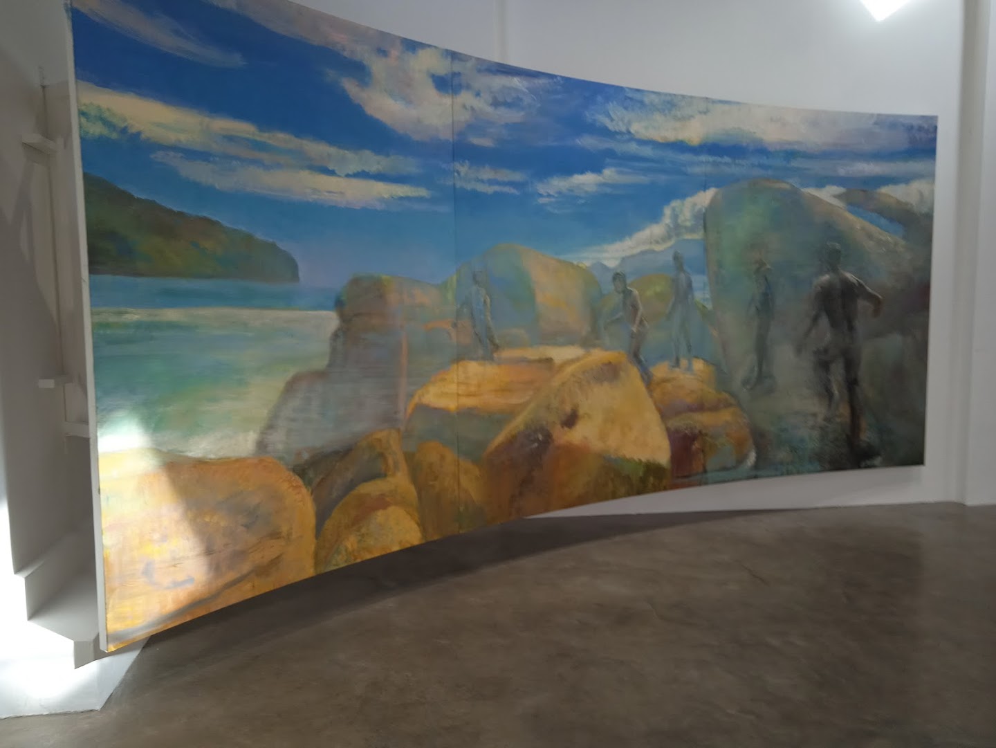 A very different pairing at Studio Voltaire on our second visit. In one room, Documents of the Recent Past, a recreation by Prem Sahib of ‘The backstreet’, a leather haunt which ran for 37 years, becoming the longest running leather bar in London. In another, Under The Same Sky, an exhibition of paintings by Jake Grewal, which aim to create a sense of human fragility and communion with nature. Mysterious nude male figures drift through rugged landscapes and lonely seascapes. The largest painting, shown below, is impressive and displayed on a curve. Well worth a visit.